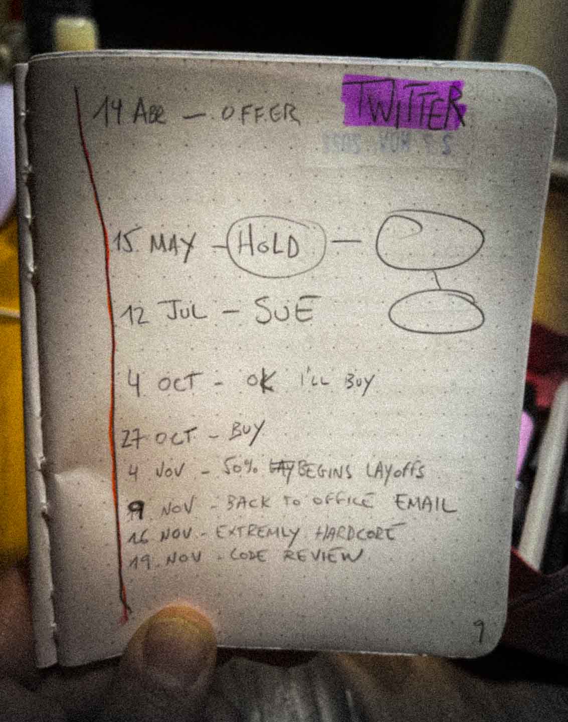 That timeline took me a while. The whole Sunday morning going through Musk’s Twitter timeline, checking news, doing screenshots, collaging them into Procreate… worth it 👍.