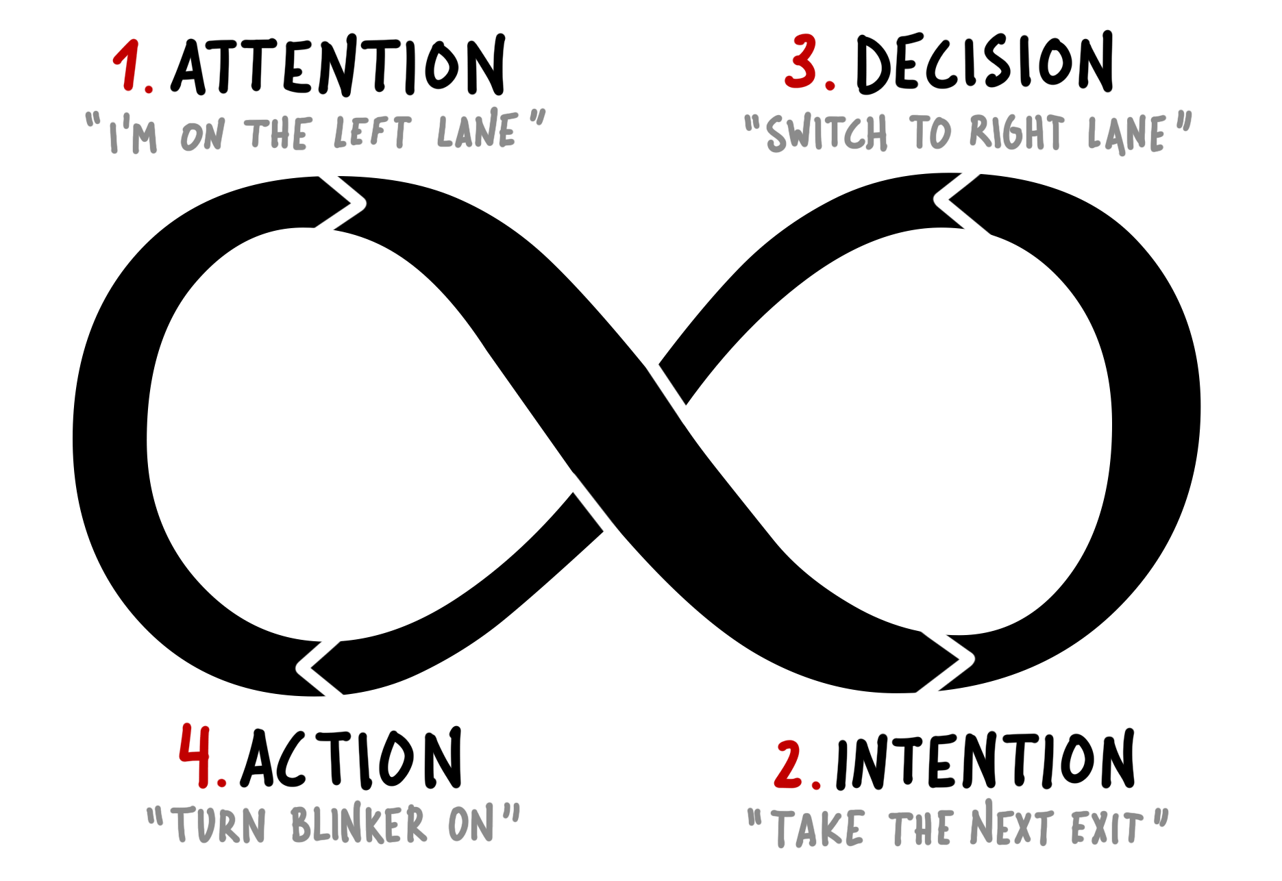 When I didn't find the way to shift right (1.attention), my obsession became to find a way to switch lanes (2.intention), when I found the spot ahead of me I decided to take it (3.decision), so I hit the gas (4.action).